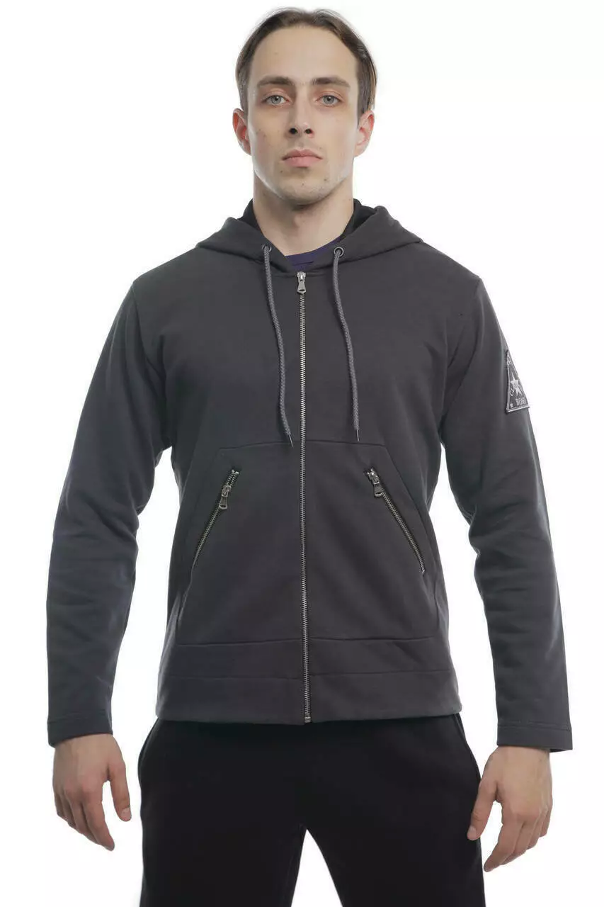 Чоловіча толстовка Urban сірого кольору виготовлена з тканини футер тринитка. Основний компонент футеру — бавовна, яка дозволяє шкірі дихати, добре поглинає вологу і не викликає подразнень. Внутрішній шар флісу робить виріб придатним для низьких зимових температур. Модель має застібку-змійку, спереду дві кишені на блискавках та капюшон, який добре захищає від вітру.