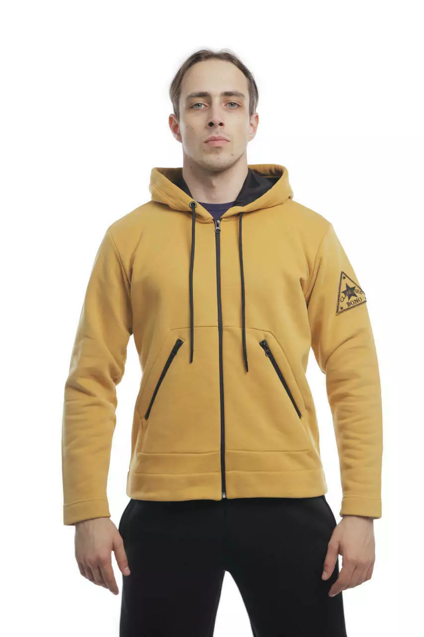 Чоловіча толстовка Urban гірчичного кольору виготовлена з тканини футер тринитка. Основний компонент футера — бавовна, яка дозволяє шкірі дихати, добре вбирає вологу та не викликає подразнень. Внутрішній шар тринитки надає виробу додаткову теплоізоляцію, роблячи його придатним для прохолодної погоди. Модель має застібку-змійку, спереду дві кишені на блискавках та капюшон, який надійно захищає від вітру.