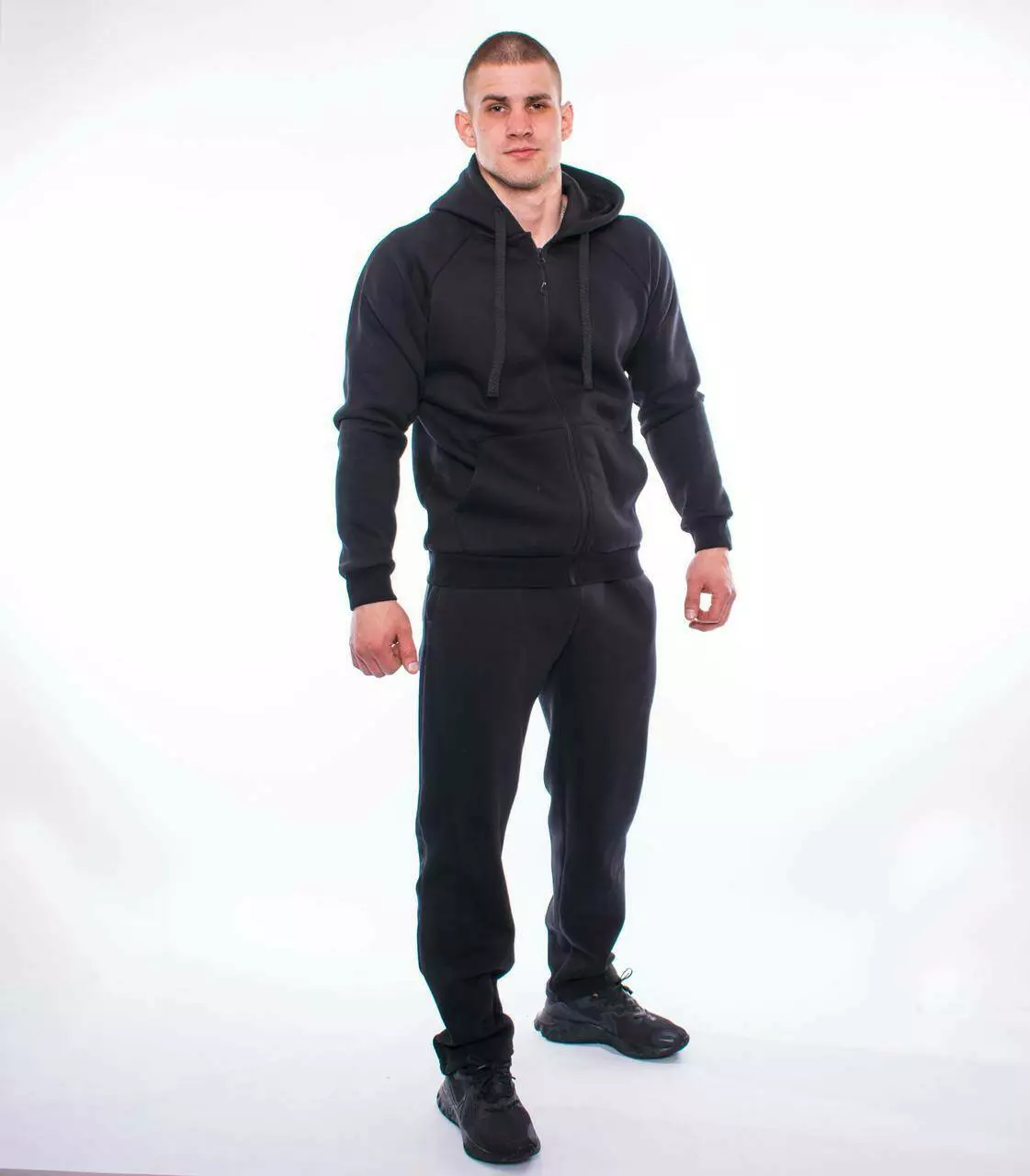 Чоловічий костюм на флісі складається з толстовки на блискавці із кишенями та штанів прямого крою на еластичній резинці. Це поєднання забезпечує зручність і практичність: капюшон надійно захищає від вітру та легкого дощу, місткі кишені дозволяють тримати необхідні дрібниці під рукою, а блискавка дає змогу легко регулювати вентиляційність виробу. Тканина — футер — приємна до тіла, чудово пропускає повітря та вбирає вологу. Завдяки класичному крою костюм пасує до будь-якої фігури, а його елементи можна комбінувати окремо для створення різноманітних стильних образів.