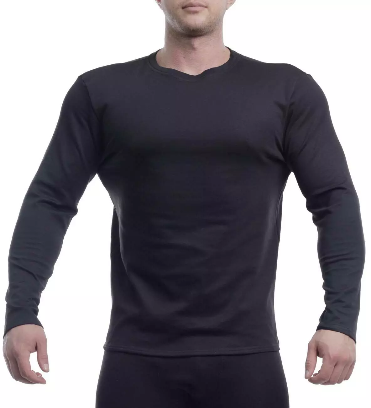 Чоловічий лонгслів виготовлений із м’якого трикотажу з внутрішнім мікроначосом вовни, він добре утримує тепло та підходить для щоденного використання у прохолодну погоду. Завдяки високому вмісту бавовни матеріал пропускає повітря та ефективно вбирає вологу. Тканина м’яка на дотик, не викликає подразнень і комфортна для тривалого використання. Еластан у складі надає виробу еластичності та підвищує його зносостійкість. Лонгслів у класичному чорному кольорі підходить як базовий утеплюючий шар або як окремий елемент гардеробу.
