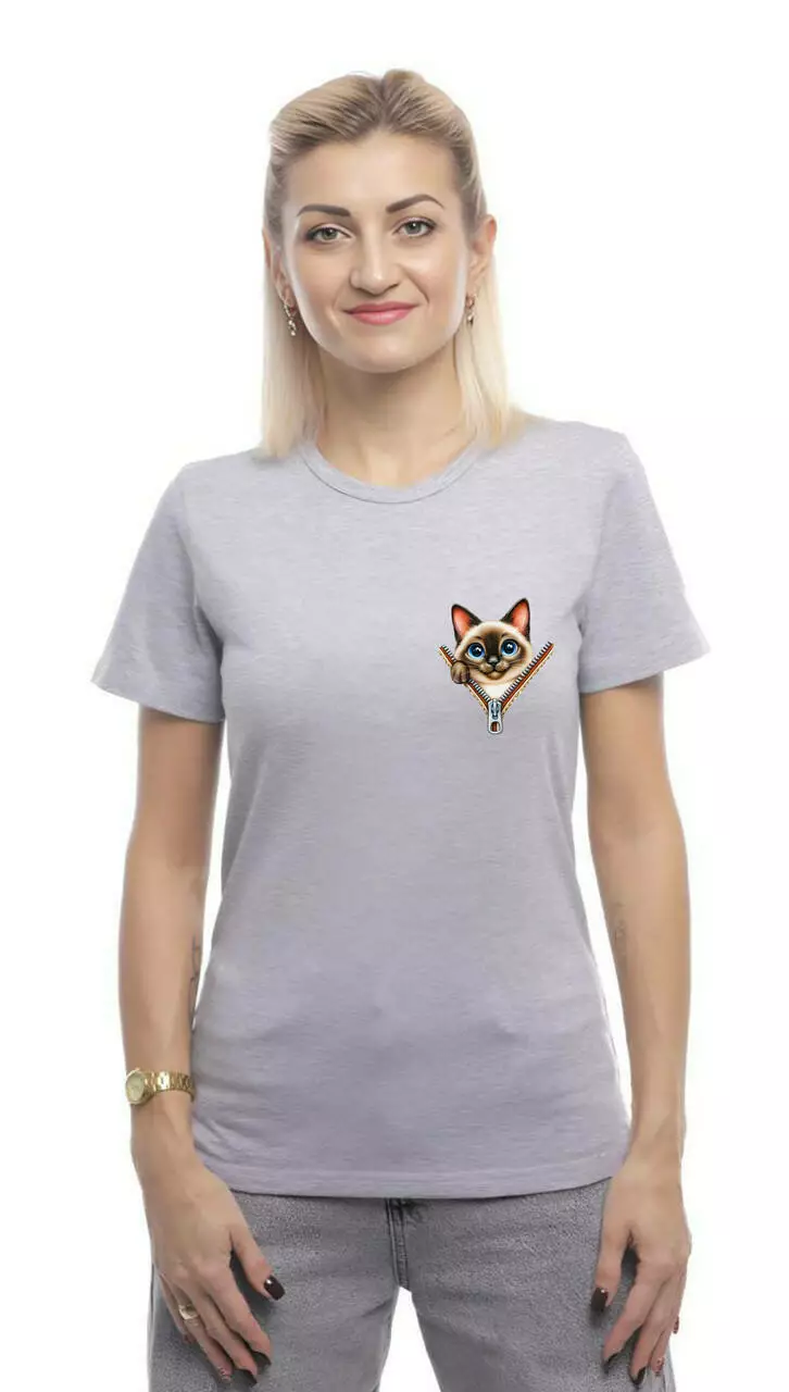 Bono Футболка жіноча прямого крою 950119 колір сірий меланж принт сіамська кішечка