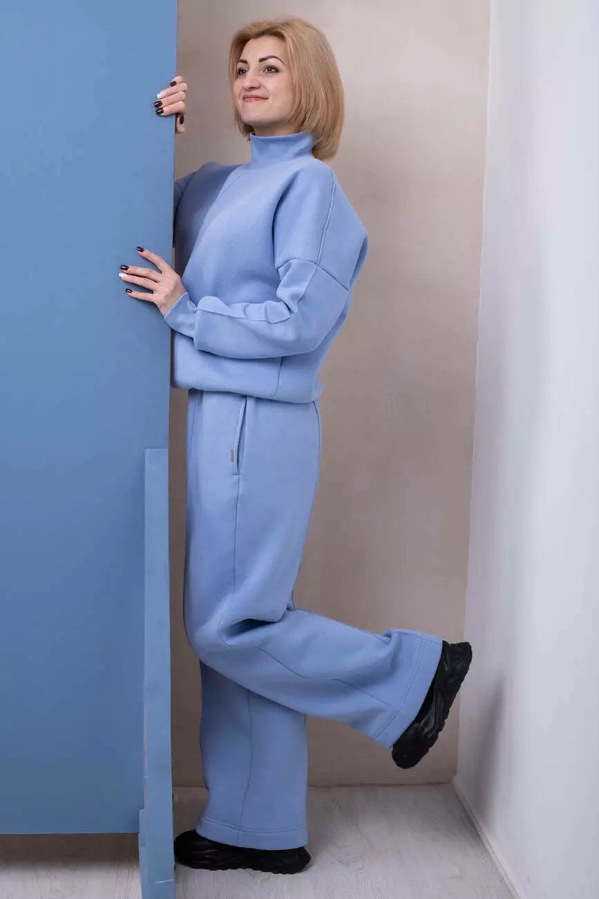 Штани широкого крою від стегон, з двома кишенями у швах та декоративною відстрочкою-стрілкою спереду і ззаду. Пояс на еластичній трикотажній резинці. Виготовлені з щільного футера з махристою внутрішньою стороною. Ідеально підходять для міжсезоння.