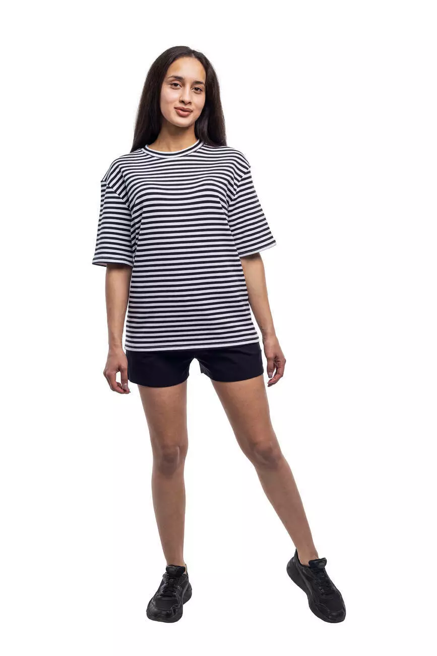 Готовий літній образ: жіночий комплект з оверсайз футболкою та базовими шортами. Виготволений з модалу, різновиду віскози, та лайкри. Тканина м'яка, шовковиста, дихаюча, довго зебрігає колір та форму. Смугастий принт додає динаміки в образі, а базові шорти вільного крою забезепечують комфорт під час руху. Легко комбінується з іншими елементами гардеробу.