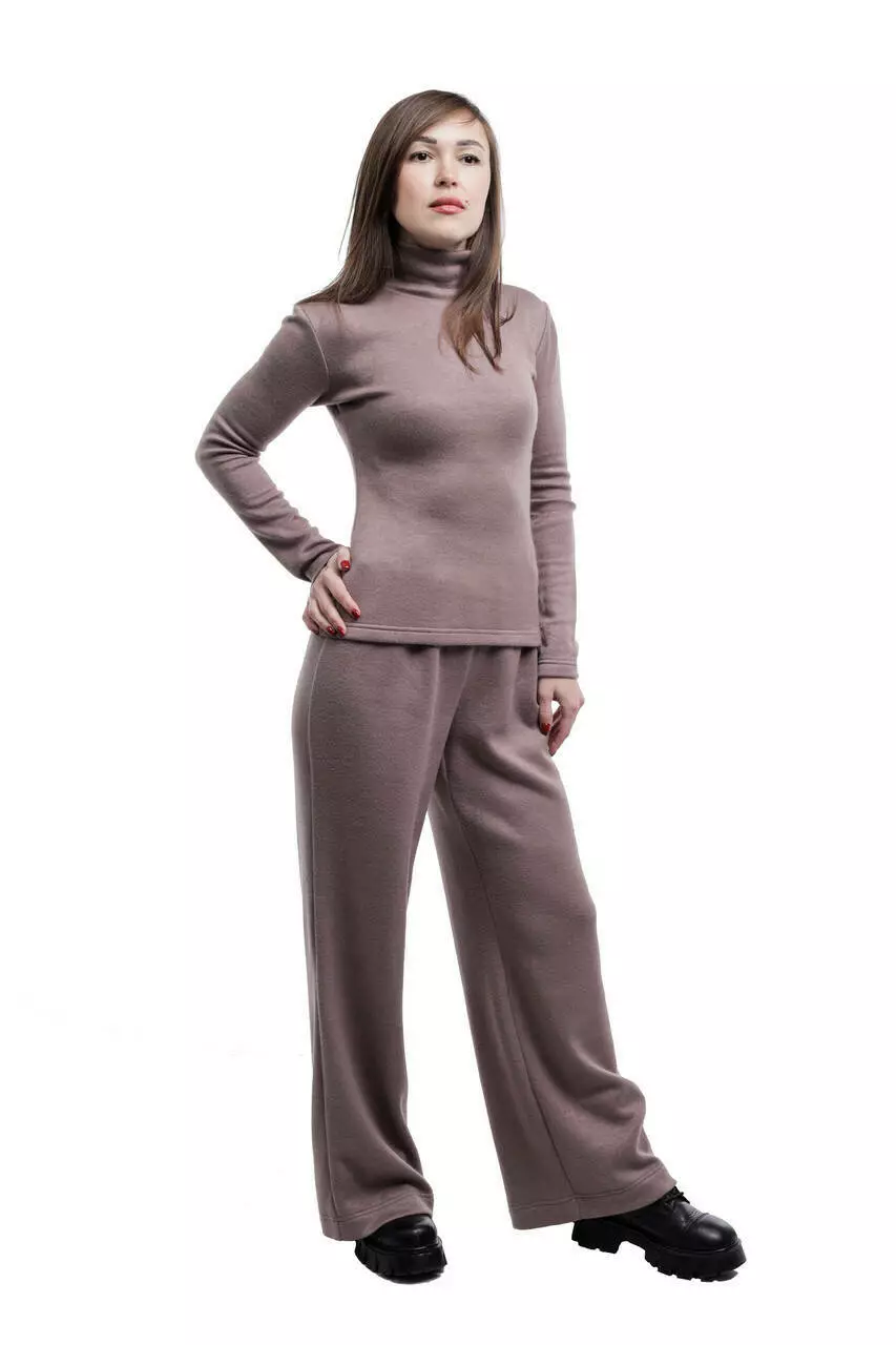 Теплий жіночий костюм з ангори без зайвих деталей. Легка, майже невагома тканина чудово утримує тепло, а завдяки поєднанню віскози й поліестеру костюм стає зносостійким і простим у догляді. Прилеглий гольф і широкі штани створюють збалансований силует, в якому комфорт поєднується з естетикою сучасного базового одягу.